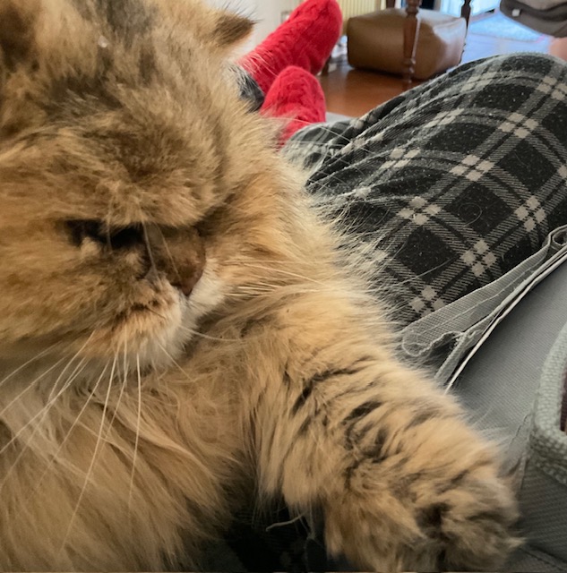 Something about a cat’s gentle purr. I read that it rumbles at a frequency very soothing for us humans. I do find it calming. My little Simba is addicted to my lap, if such a thing can be. They came over with us in 2014. We each had a carrier with a cat and reservations in-cabin for them. Oddly no one seemed to notice them. Not at check-in, not when boarding, not during the flight, not even when passing through passport control and customs on the way out of Roma airport. But that was ok. They were good travelers. They were only four then. Young boys and very adaptable. Now they are sixteen. How did that happen? I could ask the same for myself. I celebrated (?) 3/4 century on Sunday. So many years. I will miss my boys when they are gone.