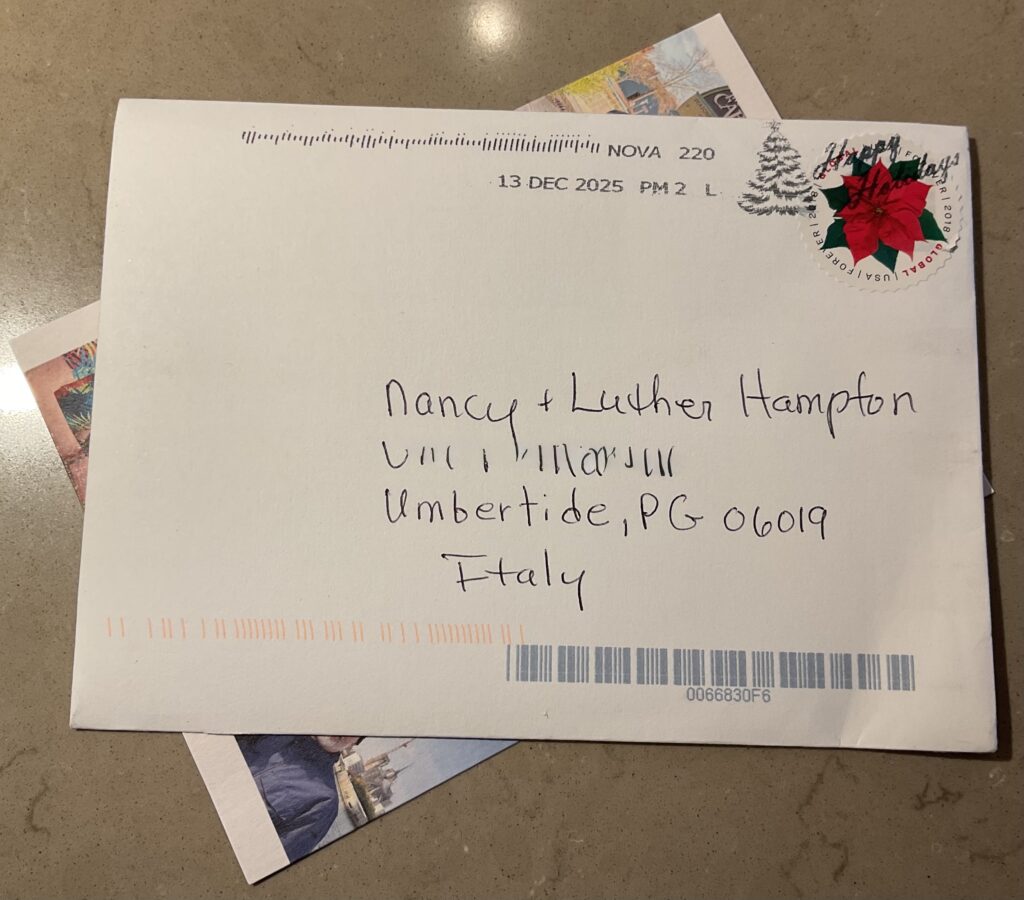 OK this is just plain weird. Yesterday, January 9, we got a holiday card from friends in the U.S. It was mailed December 13 from Virginia. Happy to hear from them! We chuckled about the Poste Italiene. Then, I heard on Facebook from a friend who got three cards today. I was agog. But wait…then another two commenters in the friends post said they TOO had gotten two holiday cards today, So what’s going on? Did the Poste Italiene save all the holiday cards from the U.S. until today to send out to us stranieri? If so, WHY? I mean, did they say, it you see a card from the U.S., put it in this basket? We will deliver in January. 🙄