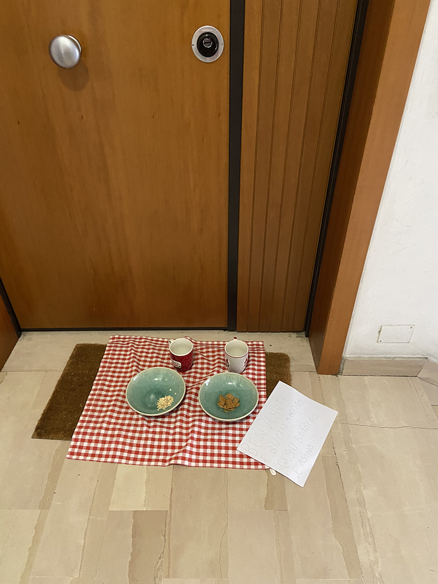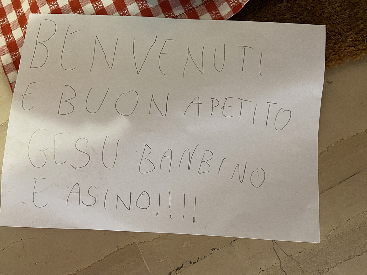 I went out into the hall and saw the offerings from the little girls who live across from us. Their sign says, “welcome and eat well baby Jesus and the donkey”. I thought it was cute. There were bowl and cups with a bit of food left behind. 🥰