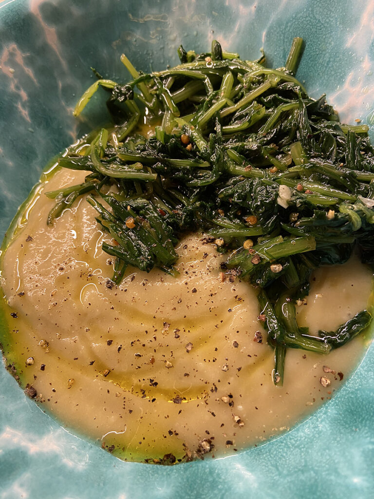 After our trip to Puglia I was inspired to make one of the lunch dishes we had while in Lecce. The entire south of Italy, called the Mezzogiorno, always has been very poor. Most of the Italians who immigrated to other countries came from these regions to find a better life. The food that evolved there is called cucina povera, literally poor cuisine. Fave è cicoria is a traditional dish made from only four ingredients. Dried fava beans, chicory, which is available everywhere here now in supermarkets, (but would have been foraged in the wild back in the day), garlic and pepper flakes. Finally it is served with a drizzle of olive oil. Gnam, gnam. (Italian for yum yum 😁)