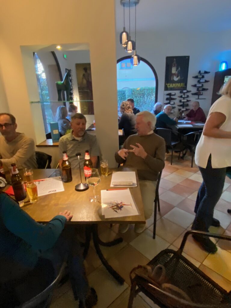 Tuesday night was the Quiz Night benefit for Books For Dogs. They have it in a local restaurant. The questions are in English. It always sells out. It is very fun and we have a team, this time it is all Americans. I think. Two people are new to me. We are at a disadvantage since the questions are compiled by a British person and they can be British centric. So best to have a Brit or two on the team. It is all for fun and a good cause so who really cares. The tickets get you a free wine and some snacks. Here are some pics of the action.